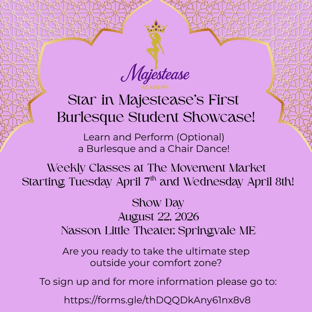 Majestease Academy, formally known as Reign Dance'N, is rebranding and to celebrate we are creating our first ever Burlesque Student Showcase, with you as the stars! Come discover the sexy, empowered, confident Majesty inside you! Are you ready to take the ultimate step outside of your comfort zone?